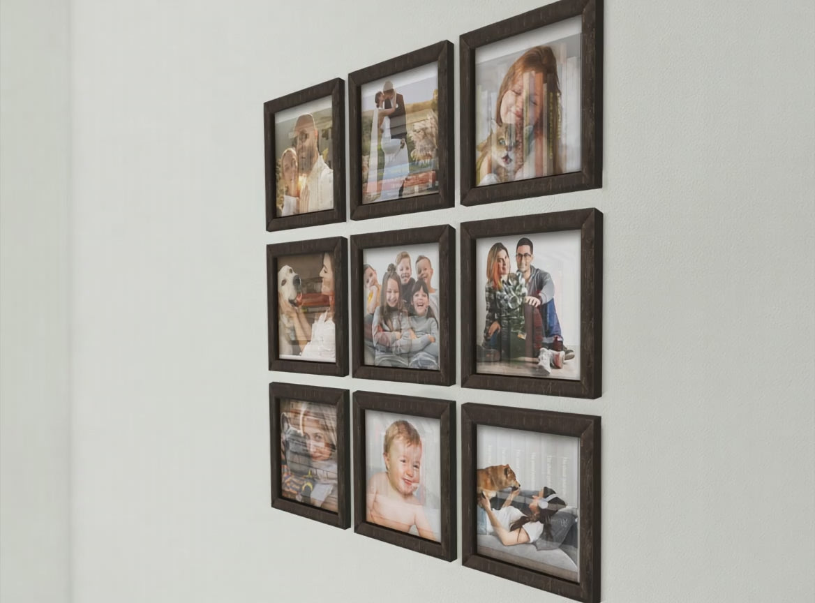 Este El juego cuadrado cuenta con marcos de 9 piezas para mostrar tus fotos favoritas. Elige el tamaño que mejor se adapte a tu espacio: