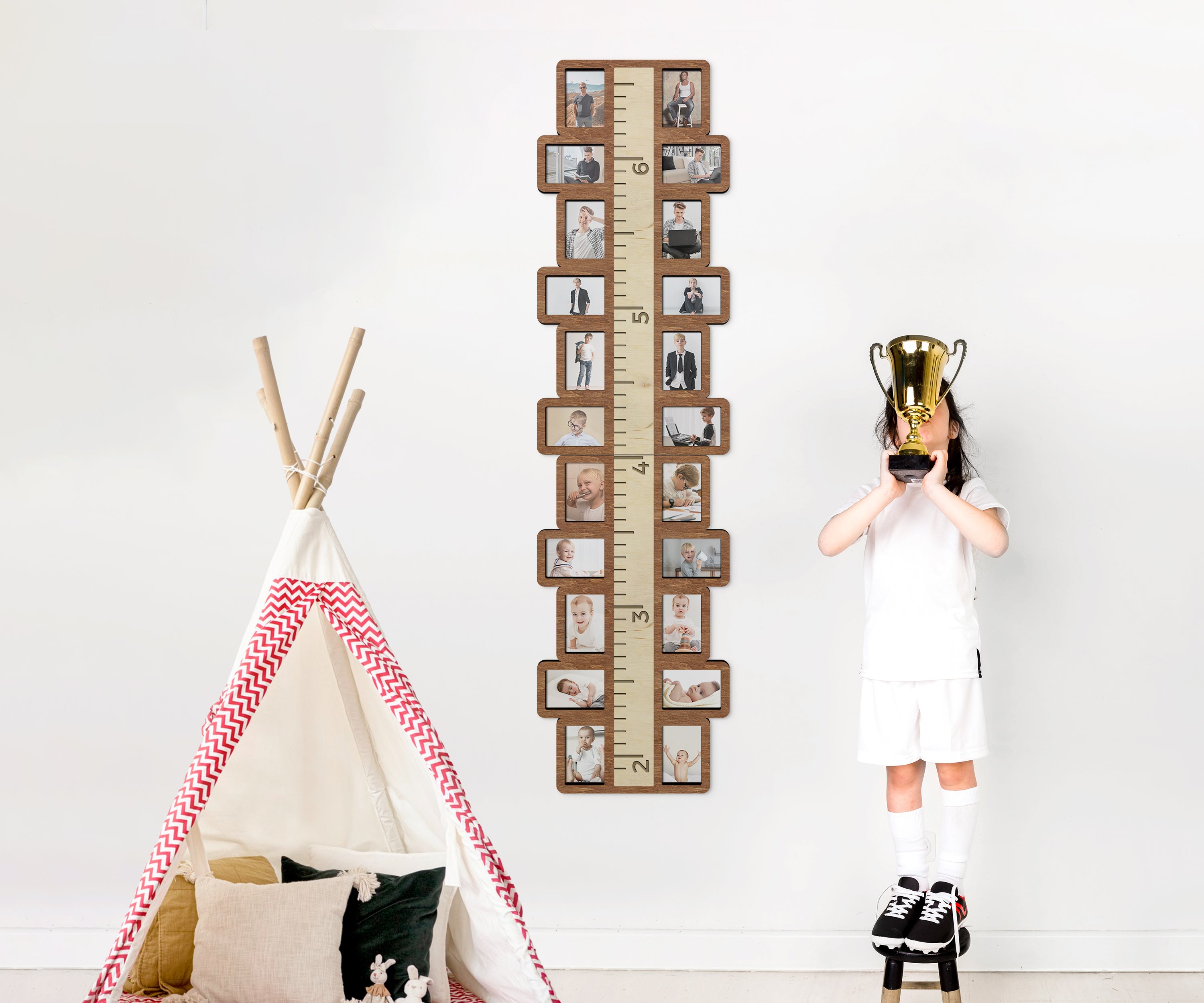 This unique wooden height ruler is more than a measurement tool—it's a keepsake to celebrate your family’s most memorable milestones. With 22 picture slots, it transforms into a personalized photo gallery that grows alongside your child, creating a timeless treasure for your home.